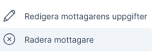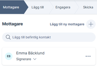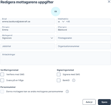 5. Du kan nu se all information som du tidigare har lagt upp, kontrollera att samtliga uppgifter är korrekta. Klicka sedan på de tre prickarna bredvid namnet, därefter ”Redigera mottagarens uppgifter ”. Ange mottagarens information samt önskad signeringsmetod (Bank-ID), spara och fortsätt till "Skicka".