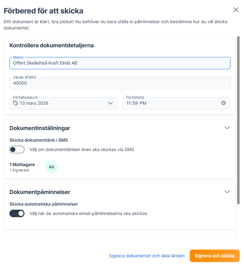 En kontrollruta öppnas där du granskar dokumentet. När du kontrollerat klickar du på ”Signera och skicka” för att skicka dokumentet till mottagaren.