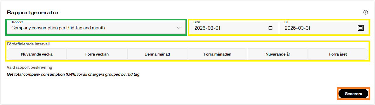 5. Ange önskat tidsintervall genom att antingen välja ett förinställt alternativ eller genom att manuellt ange ett start- och slutdatum (markerat i gult).