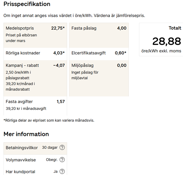 Priserna som visas i mejlet är exklusive moms men inklusive elcertifikatsavgift