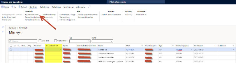 Finns det ett huvudkontrakt kopplat (gulmarkerat i första bilden ovanför) behöver det kopplas bort för att komma åt ”Byt kontraktsmall” som annars är grå.