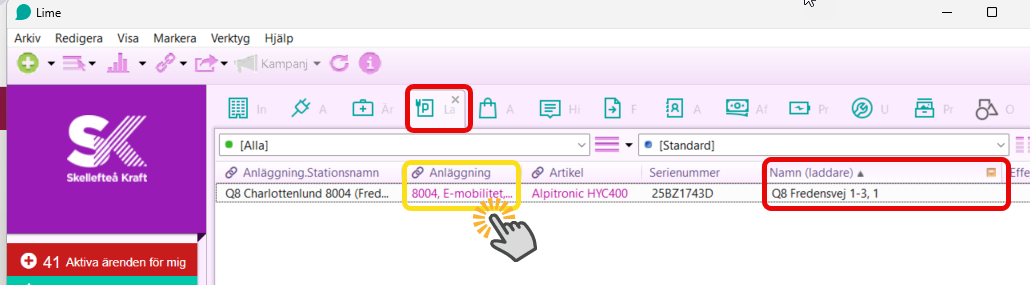 Nu kan du gå till fliken laddare i lime och filtrera fram adressen under namn (laddare). Klicka sedan på anläggningen (här ser du även stationsnr.)