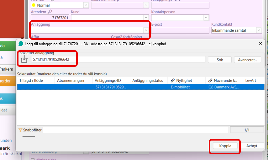 Nu kan du under anläggning i ditt ärende söka fram anläggningsID och koppla ärendet.