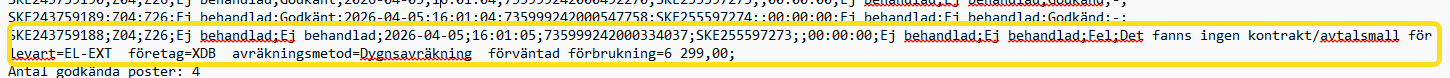 I manuellt godkännande av Z04A har det dykt upp en feltext pga en bugg mars 2026 "Det fanns ingen kontrakt/avtalsmall för levart=EL-EXT företag=XD avräkningsmetod=Dyngsavräkning förväntad förbrukning= 6299,00"