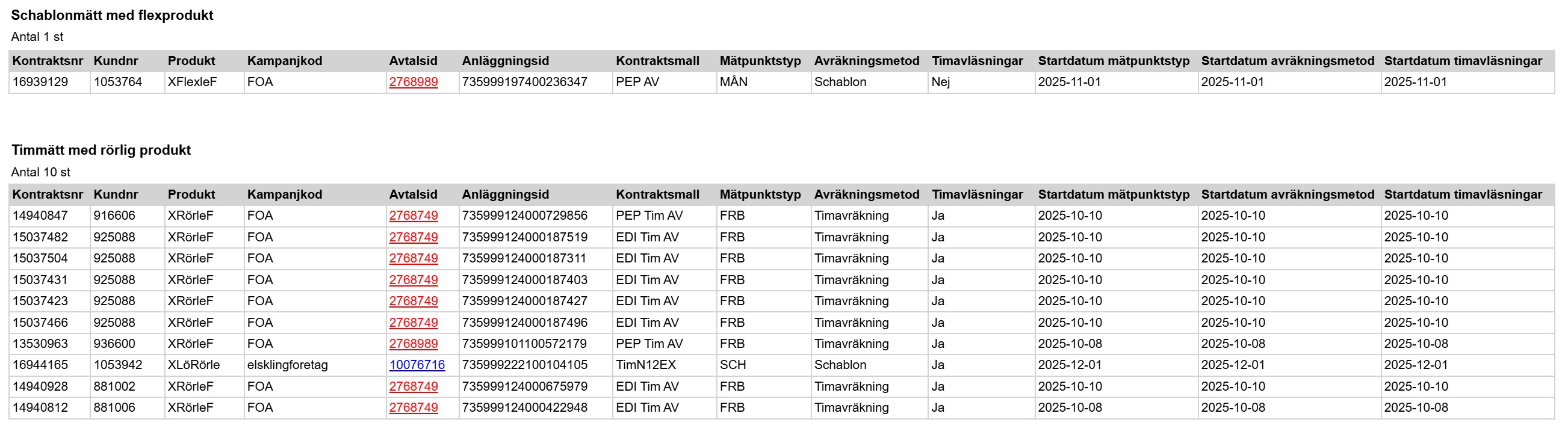 Här visas kontrakt där kontraktsmallen inte stämmer överens med produkten. Om anläggningen är timmätt så ska kontraktet ha en flexprodukt, och motsatt om anläggningen är schablonmätt så ska kontraktet ha en rörligprodukt. FOA kunder kollas av företag.
