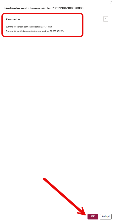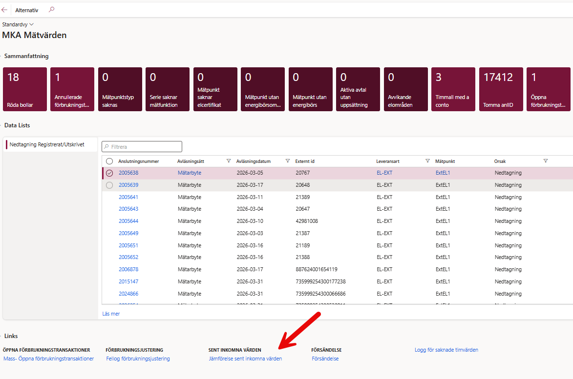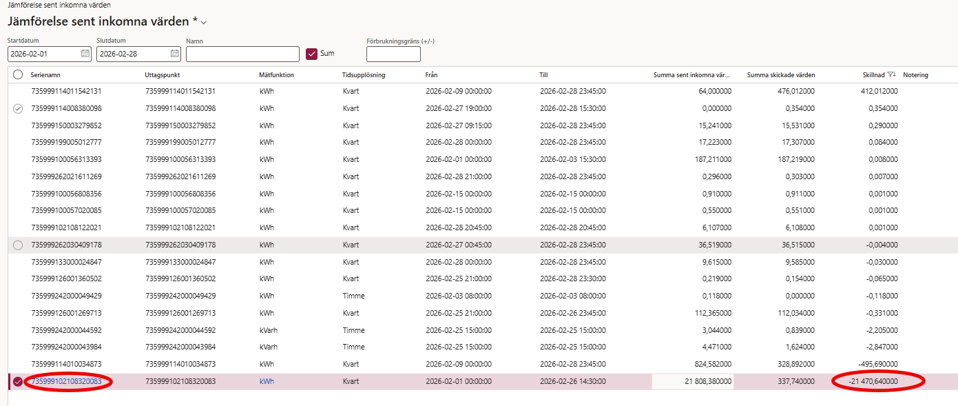 Så i detta fall kan vi kolla på anläggningen där vi fakturerat 412kWh för mycket. Vi ska ska också göra dem anläggningar där vi fakturerat 21 470kWh och 495kWh för lite eftersom på dessa blir differensen mer än 100kr för kunden.