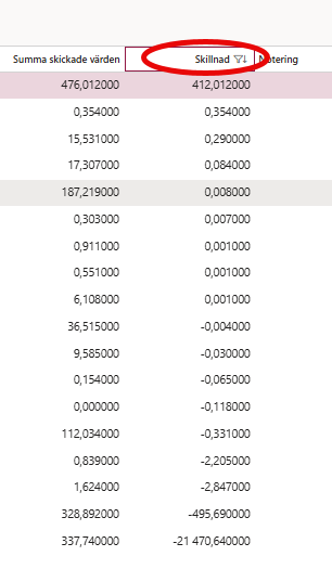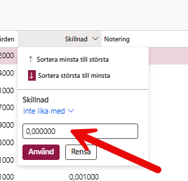 I kolumnen Skillnad kan man sortera bort de rader som inte har någon skillnad ( 0,000000 ) och klicka på Använd.