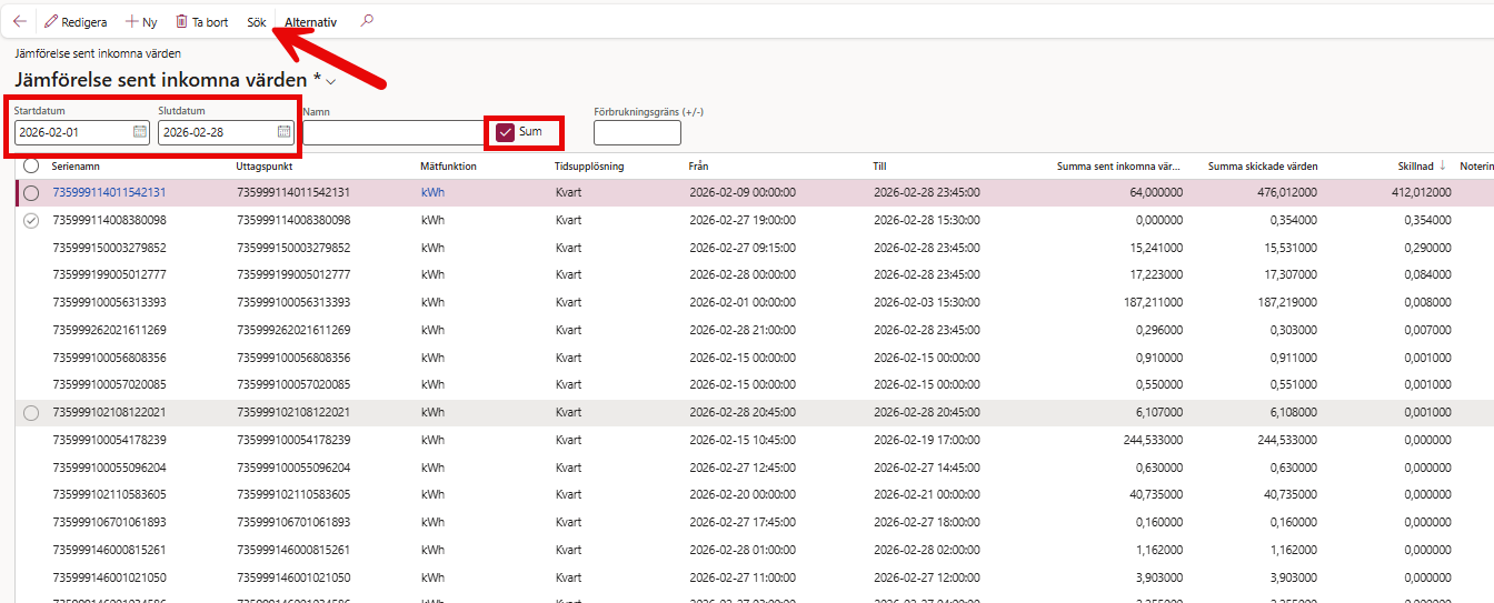 T.ex. när vi kollar denna lista i början av mars så söker man fram perioden 2026-02-01 -- 2026-02-28. Bocka sedan i Sum och tryck på sök där uppe.
