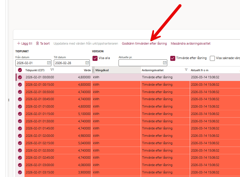 I denna lista visas kvartsvärden som vi fått av kundens nätbolag där dem först skickat värden och sedan skickat korrigerade värden som är olika varandra och därför ska vi ersätta dem sent inkomna värdena med dem tidigare så att kunden får en korrekt faktura.