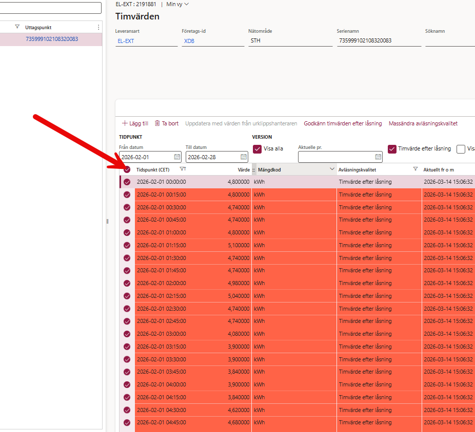 8. Tryck sedan i bocken under tidpunkt så markeras alla kvartsvärden som vi ska läsa in.