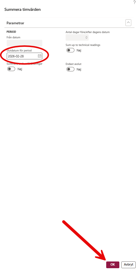 13. Skriv vilken period vi vill summera under Slutdatum för period och tryck därefter OK så kommer det skapas en ny förbrukningstransaktion.