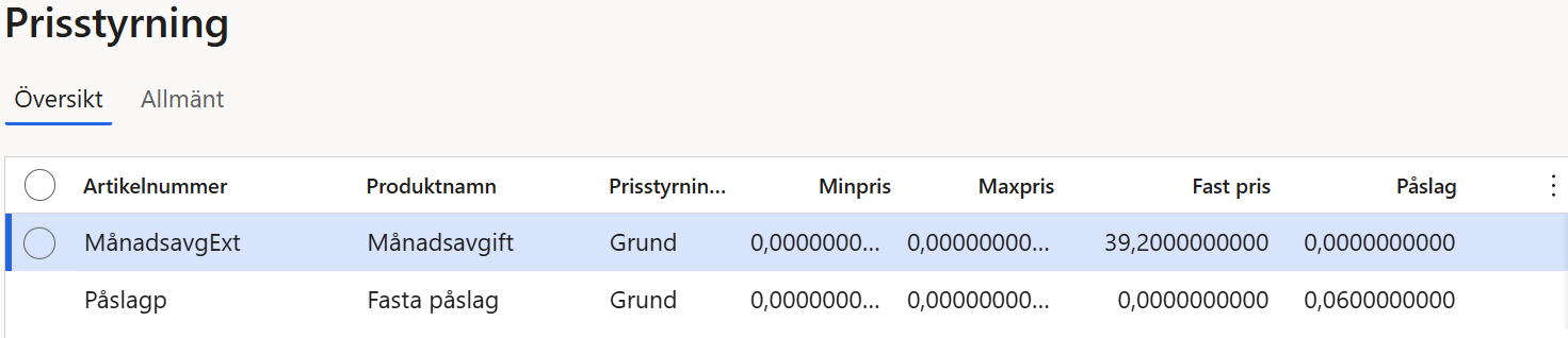 Om kunden inte har rabatter, läggs priserna enbart på huvudprodukten under fast pris enligt nedan.