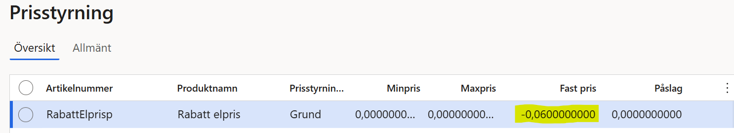 Rabatten på elpriset läggs in på XRabatt som fastpris (OBS, glöm inte minus före).