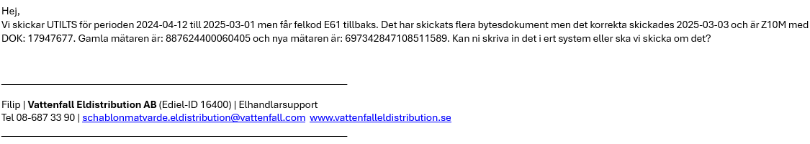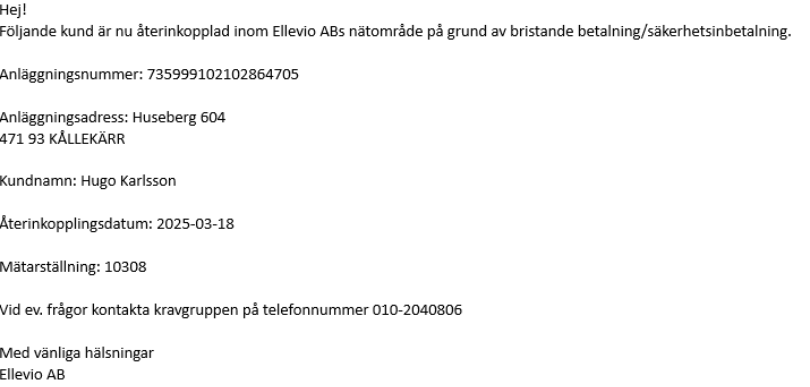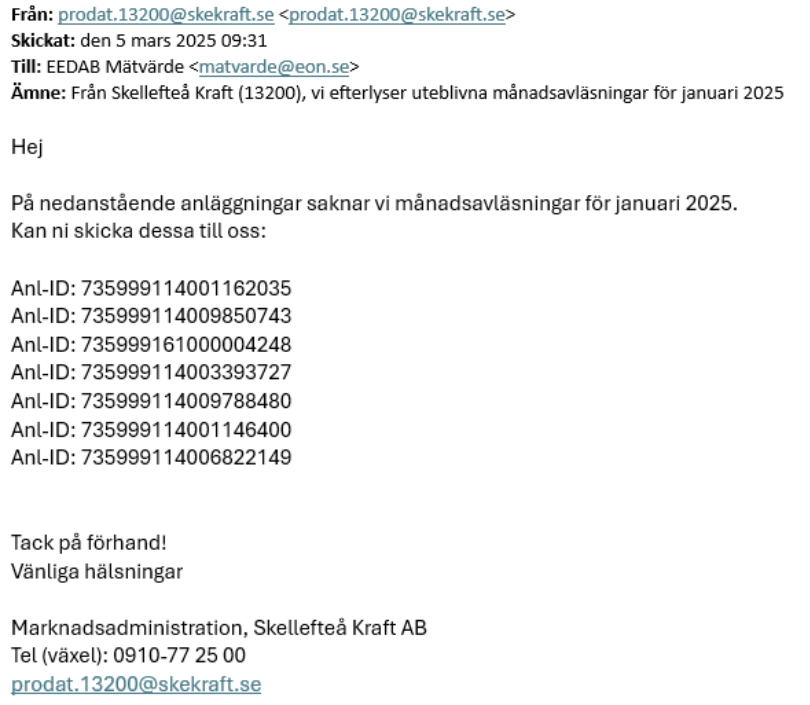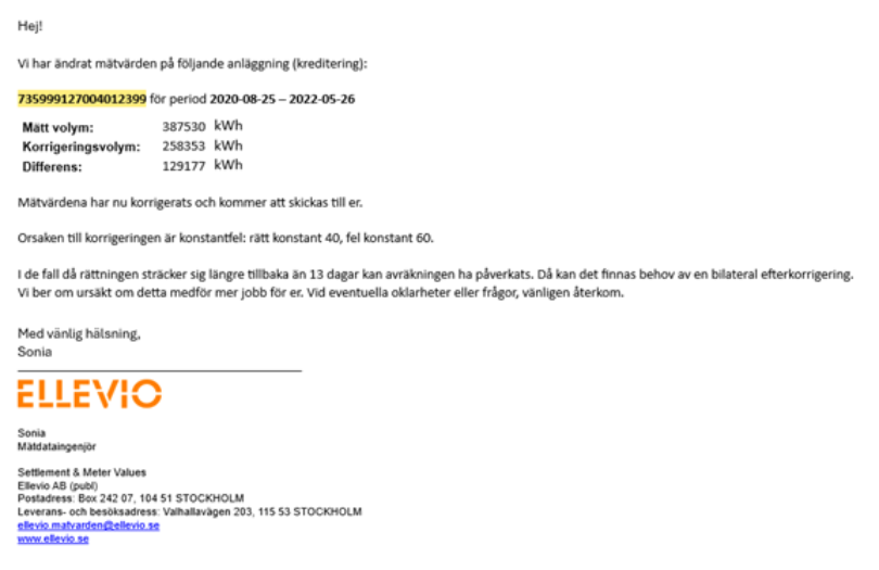 Ibland kan vi få mejl från Ellevio eller något annat nätbolag att dem skickat nya mätvärden för en längre period tillbaka som vi redan har fakturerat, dessa mejl kan se ut så här: