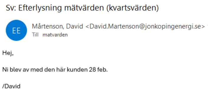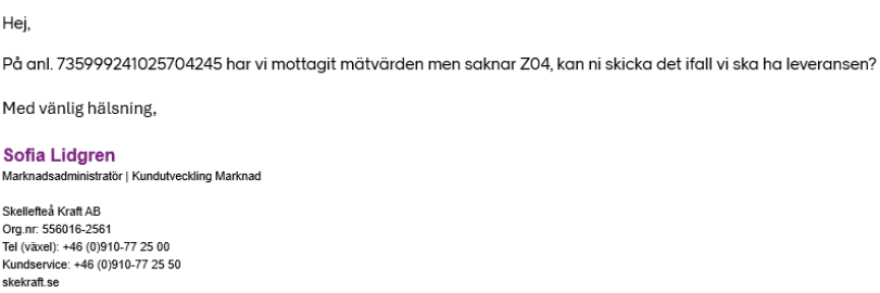 Om vi inte fått Z05 så svarar vi på mejlet att vi vill att dem skickar det. Om vi har mottagit Z05 och har slutdatum i kontakt så kan vi flytta mejlet till fliken ”KLARA” om mejlet är i matvarden@skekraft.se eller till fliken ”Avklarade mätvärden” om mejlet är i prodat13200@skekraft.se