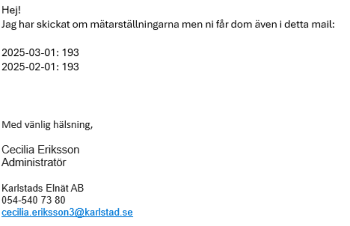 Så här ser ett mejl ut när nätbolagen skickar avläsningarna i mejlet: