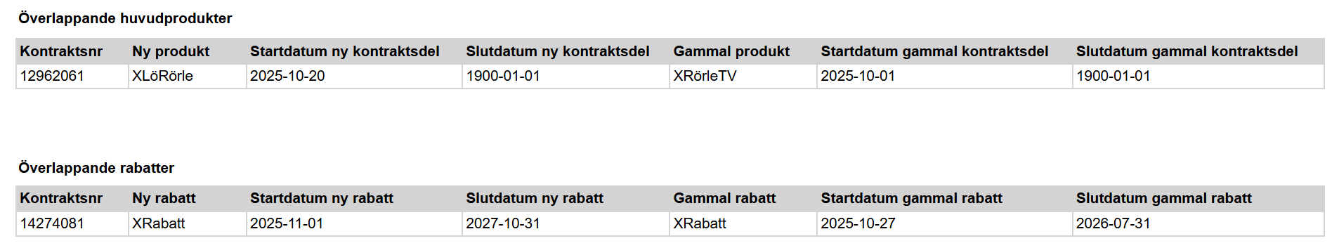 Här visas kontrakt som har överlappande huvudprodukter eller rabatter. Oftast kan det var så att ett slutdatum saknas på föregående produkt eller det finns en produkt inlagd som inte ska vara där. Ibland kan vi behöva justera startdatum på den senaste kontraktsdelen om det finns ett fastavtal med slutdatum.