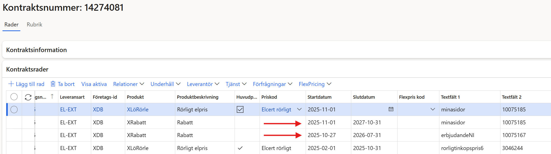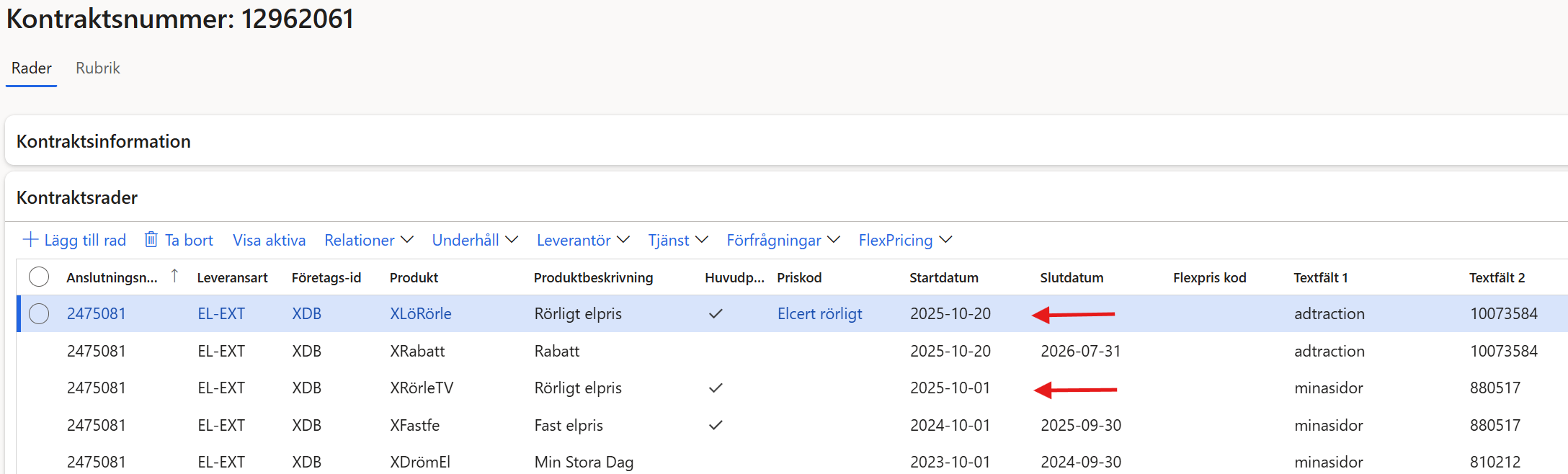 Här kan vi see att vi har ett XRörleTV utan slutdatum samt ett XLöRörle med startdatum 2025-10-20 så då överlappar dem kontraktsdelarna. Lägg in slutdatum på XRörleTV.