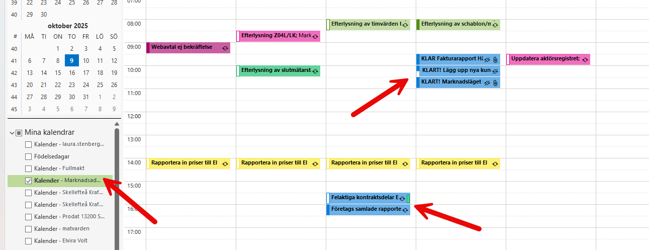 • Kolla MKA kalendern i outlook om det ligger några poster markerade i blått. Då många delar är sekretessbelagda finns manualerna i kalenderposten. När man har hanterat en kalenderpost skriver man KLART! i själva posten (OBS! Enbart den aktuella förekomsten inte hela serien). Vissa poster behöver inte göras just den dagen, kolla i manualen om det går göra tidigare.