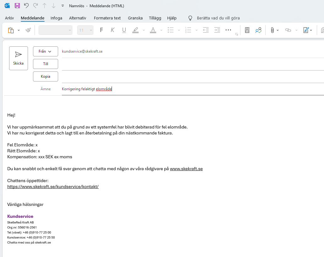 Har kunden legat i ett billigare elområde (tex kunden har betalat för SN2 istället för SN3) samt om det är en produktion så ändrar vi bara uppgifterna, vi räknar inte på någon återbetalning då kunden har haft ett för lågt pris. Ändra och gör en historik logg i lime om att elområde ändrades från och med datumet för ändringen. (Backa alltid till den första i månaden sålänge det inte har fakturerats än.