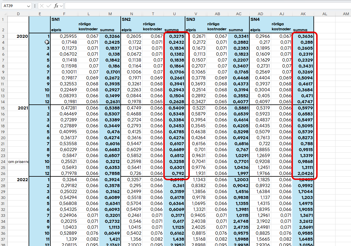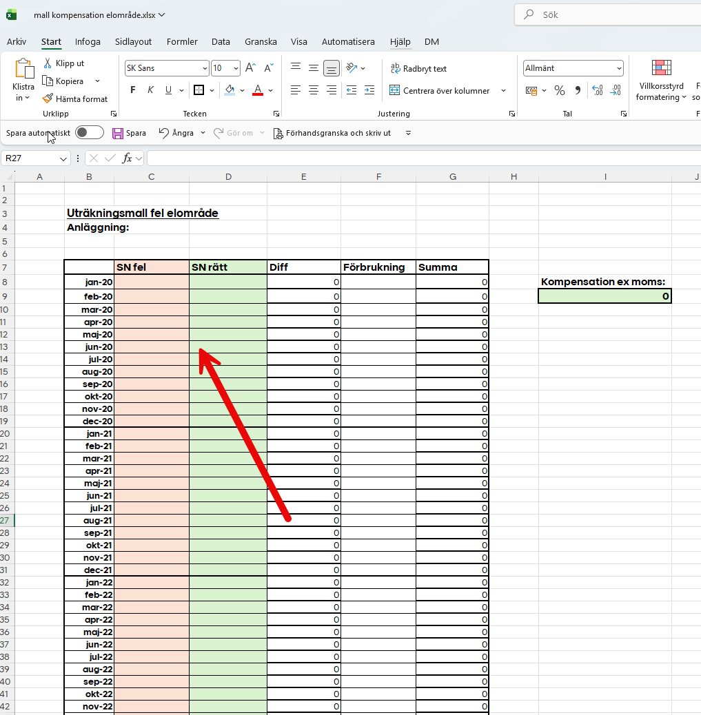 Öppna mallen för uträkningen. Där finns det 2 flikar, en mall som man kan använda till kunden (OBS, kopiera fliken till en ny bok som du kan spara under dokument på kunden i Lime) och en till flik med rörliga priser från och med 2020. (Fasta avtal kompenserats inte).