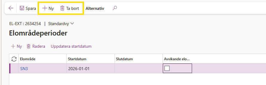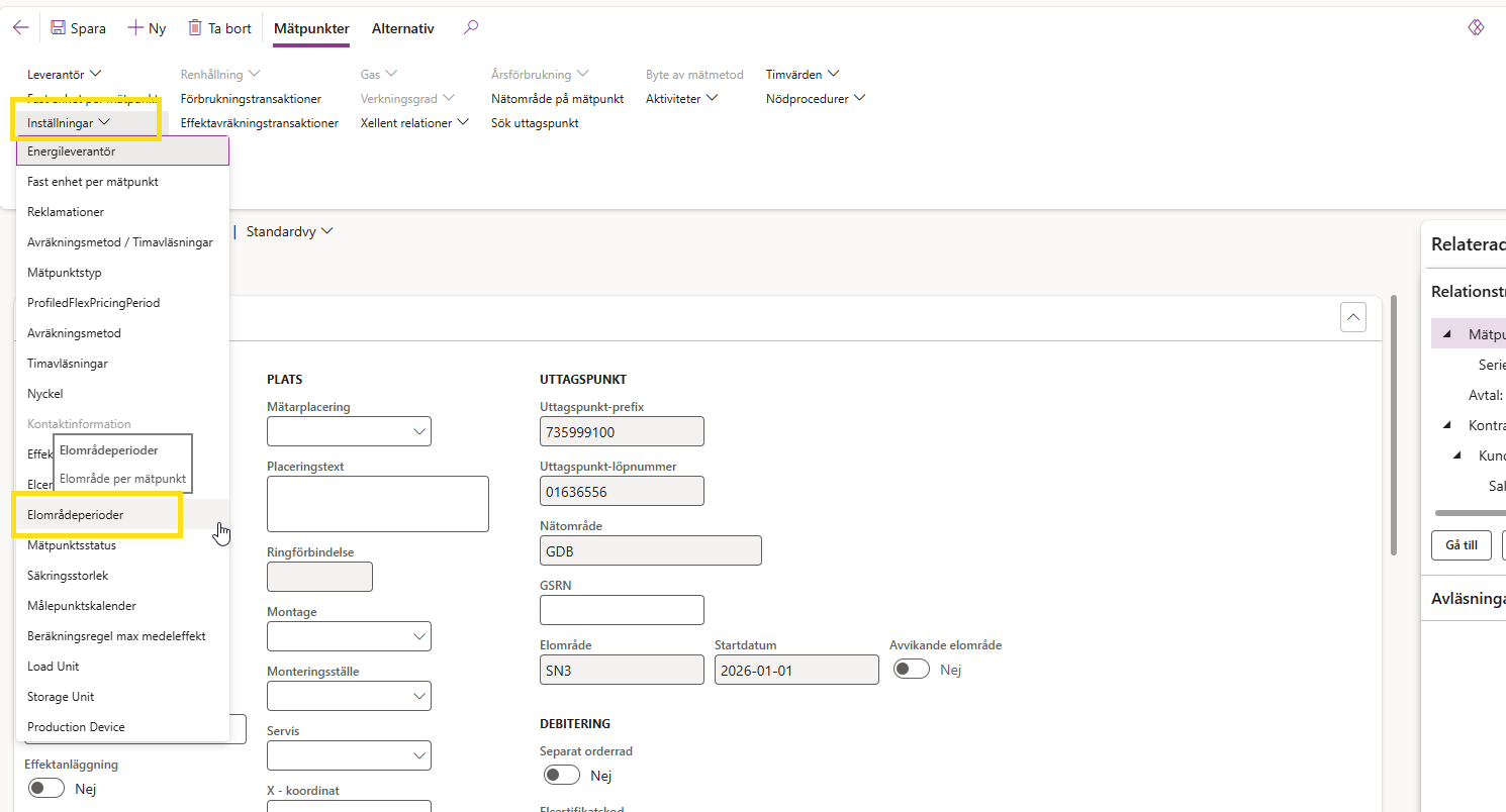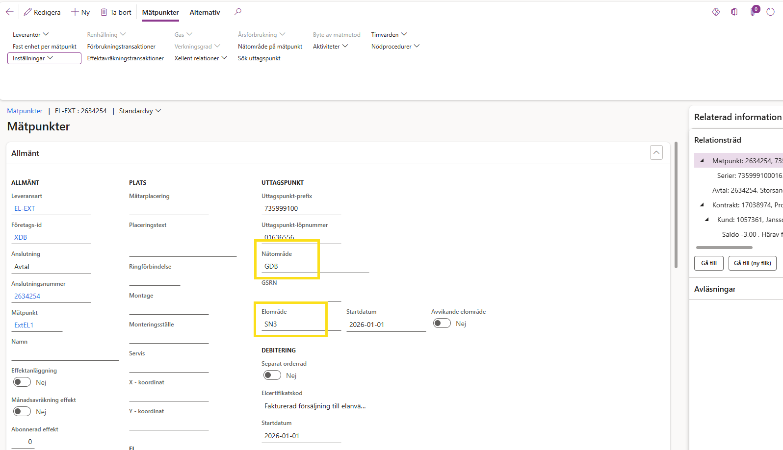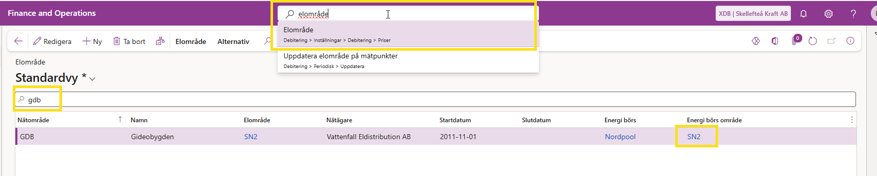 Här ser ni att nätområdet ligger kvar i fel elområde. Man kan kontrollera vilket som är rätt genom att gå till Elområde i D365.
