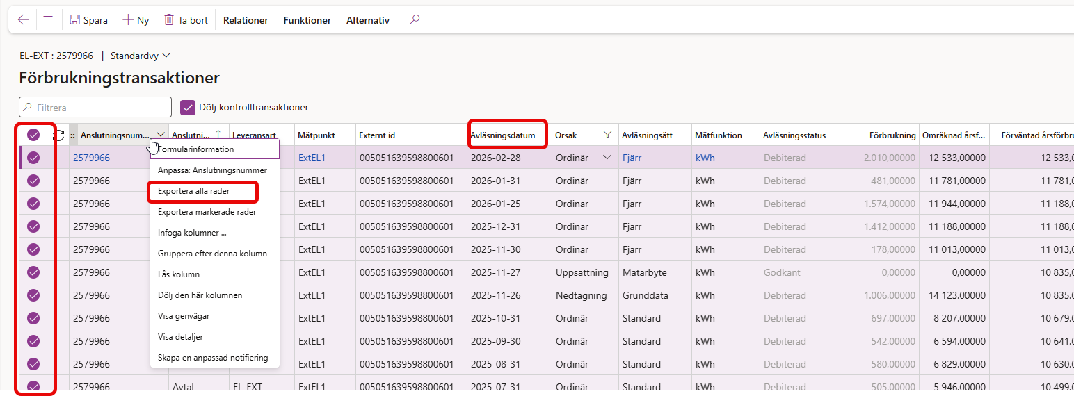 Gå sedan till Förbrukningstransaktioner på anläggningen i D365 och ta ut dessa. Ett tips är att enbart visa perioden det gäller för och visa det äldsta datumet först. Dubbelkolla så det inte finns flera avläsningar på en och samma månad då det då blir fel i mallen. Räkna då manuellt ihop om det finns två värden under samma månad och fyll i.