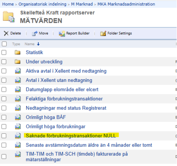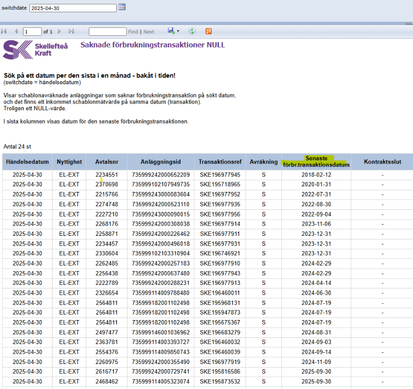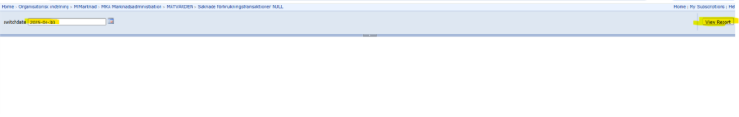 Klicka sedan på “view report” så kommer rapporten visa anläggningar som saknar förbrukningstransaktion på sökt datum och det finns ett inkommer NULL-värde på samma datum.
