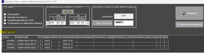 1. Sedan kommer det fram rader på vilka anläggningar vi saknar månadsavläsning på.