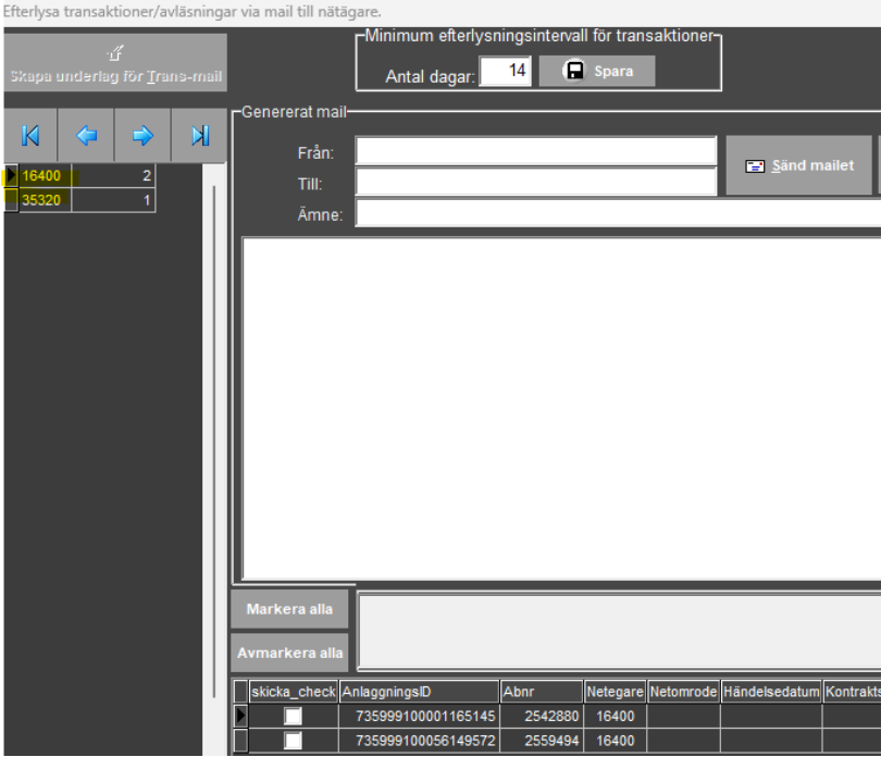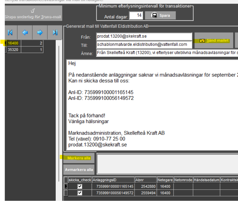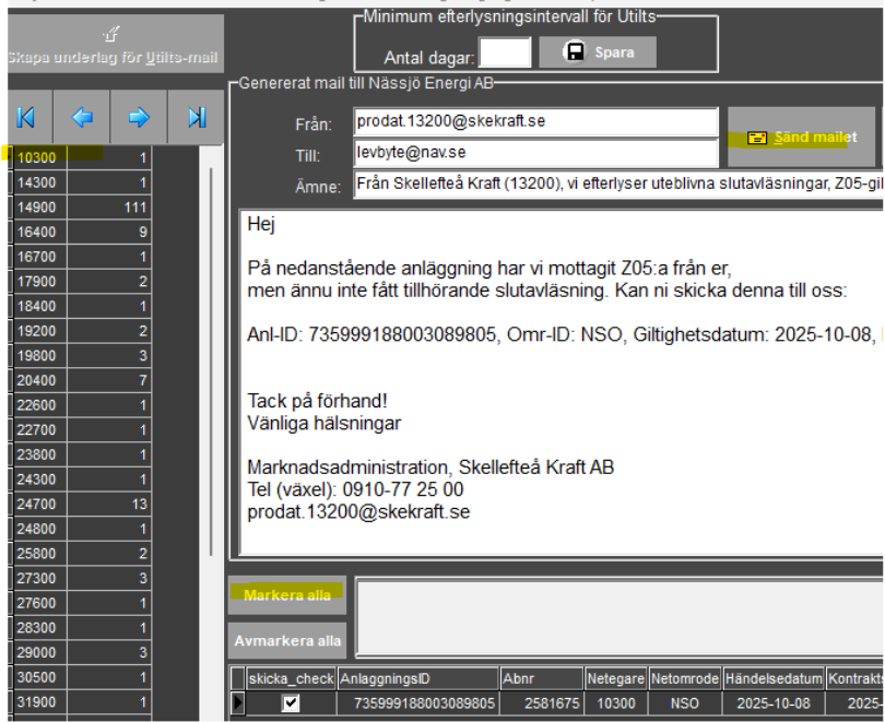 1. Ställ dig då på det nätbolag du vill efterlysa, tryck på markera alla och sedan på sänd mejlet.