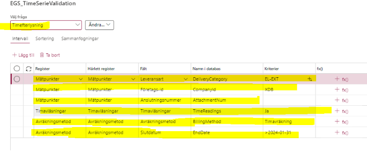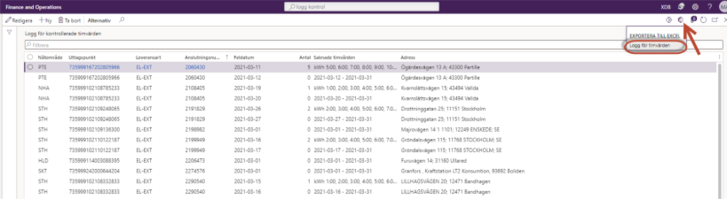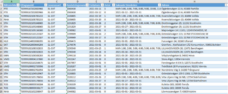 !!! Vi har ett problem där det i kolumnen ”Saknade timvärden” kan dyka upp texten ”Ingen serie kopplad till mätpunkt” på någon enstaka anläggning. Dessa stoppar integrationen i följande steg och måste därför tas bort. Spara anläggningsID och ta bort den felaktiga raden för senare utredning. !!!