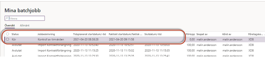 Allmänt – Förfrågningar – Batchjobb – Mina batchjobb