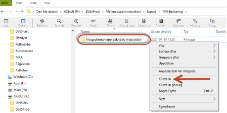 Högerklicka och klistra in filen i ”Integrationsmapp_saknade matvarden” som du hittar i AXInUt(P:)\D365Prod\Marknadsadministration\Export\TIM-hantering