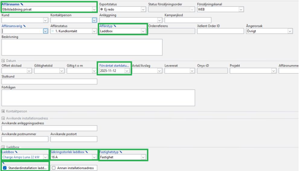 Affärsartikel Grön teknikavdrag och Standardinstallation laddbox ska alltid läggas till på beställning av laddbox.
